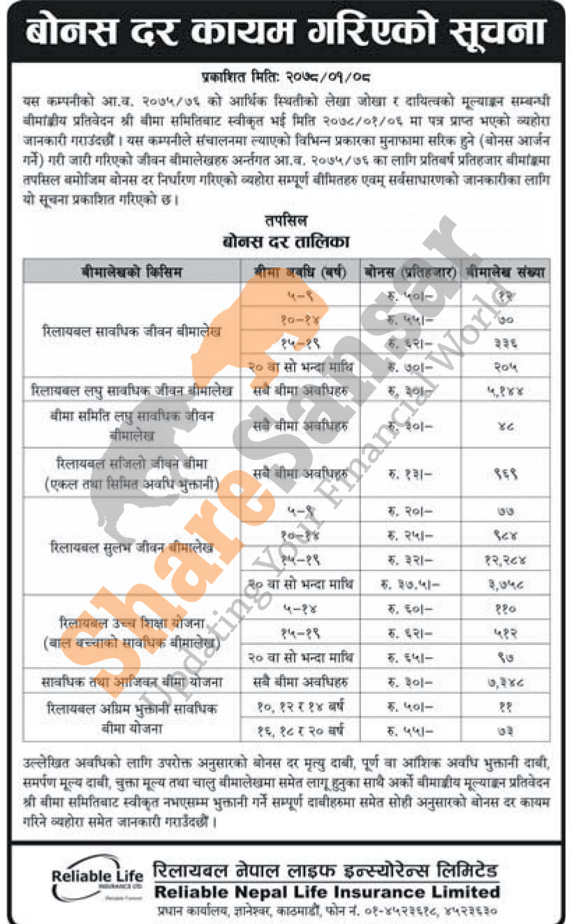 Reliable Nepal Life Insurance Limited has published a notice regarding a new bonus rate for its different life insurance policies.