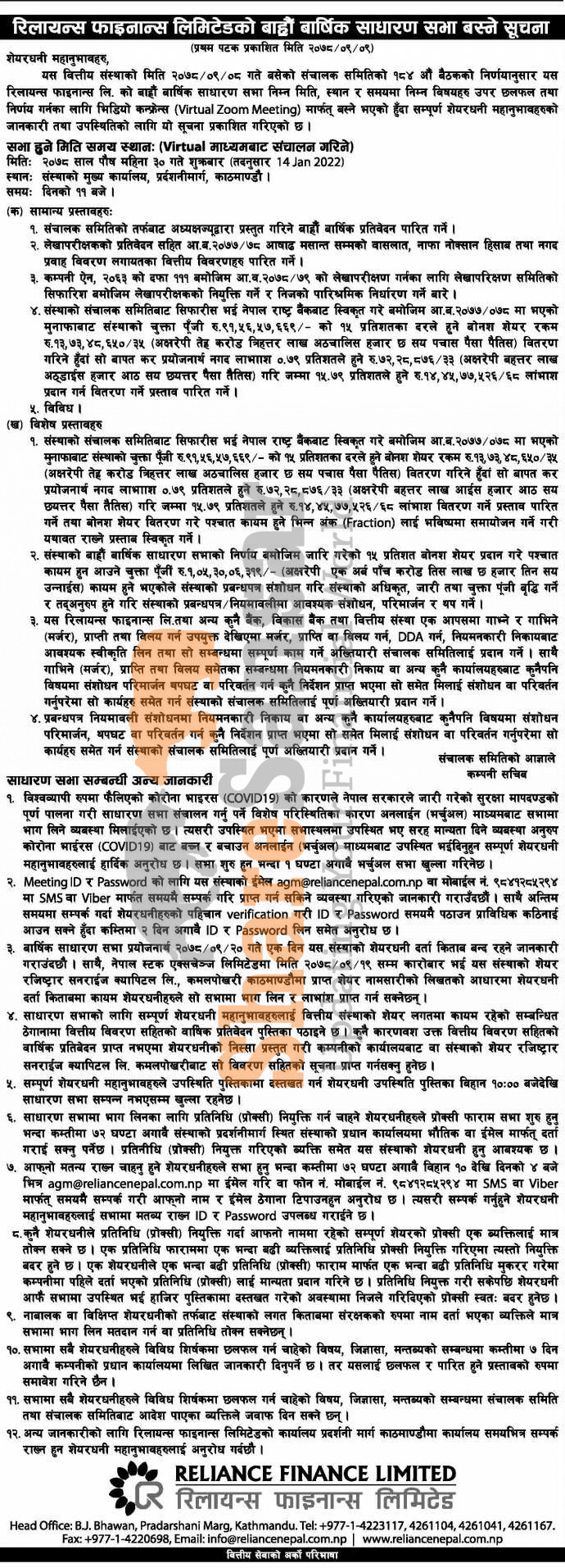 Reliance Finance Limited has announced its 12th AGM going to be held on 30th Poush, 2078.