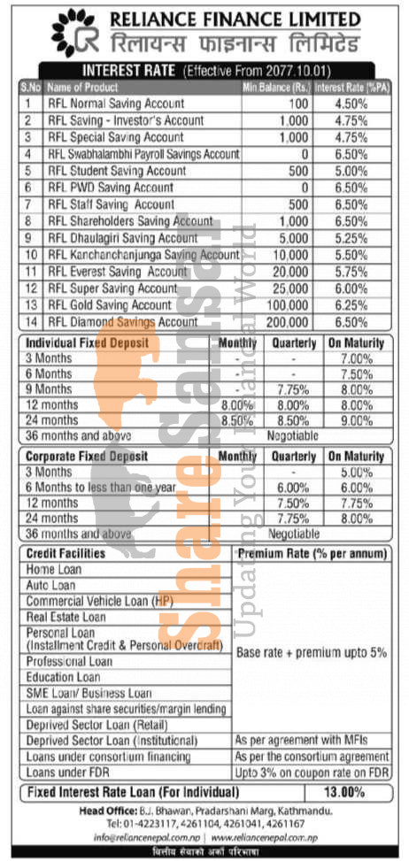 Reliance Finance Company Limited has published a notice regarding the new interest rate for deposit and loan products and it's effective from 1st Magh, 2077.
