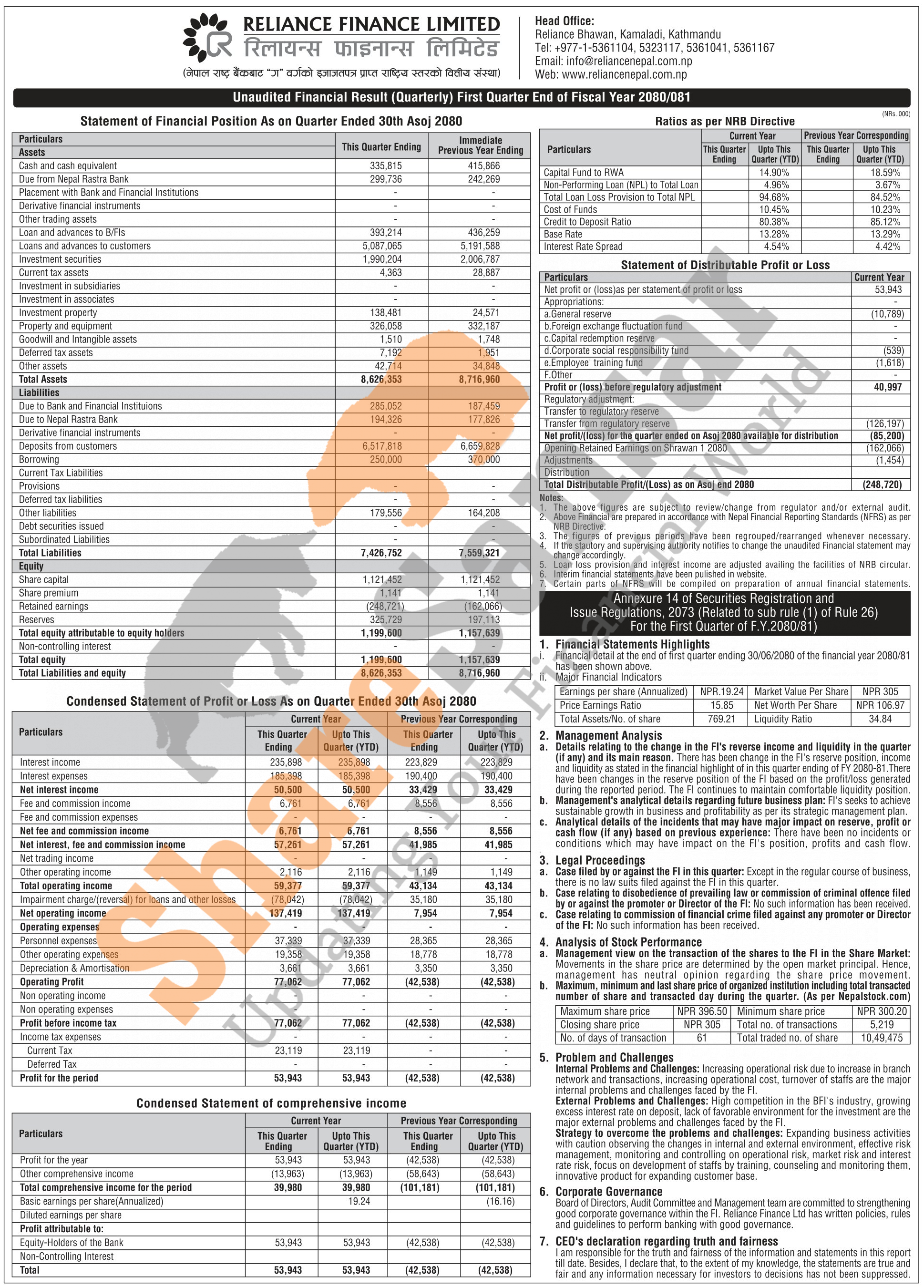 Reliance Finance Limited has posted a net profit of Rs 53.94 million and published its 1st quarter company analysis of the fiscal year 2080/81.
