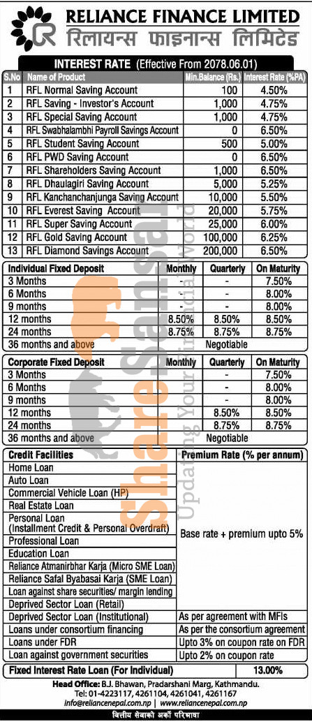 Reliance Finance Limited has published a notice regarding the new interest rate for deposit and loan products and it's effective from 1st Ashoj, 2078.