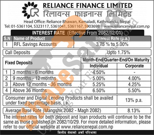 Reliance Finance Limited has published a notice regarding the new interest rate for deposit and loan products and it's effective from 1st Chaitra, 2082.