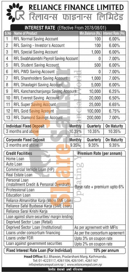 Reliance Finance Limited has published a notice regarding the new interest rate for its deposit and loan products and it's effective from 1st Mangshir, 2078.