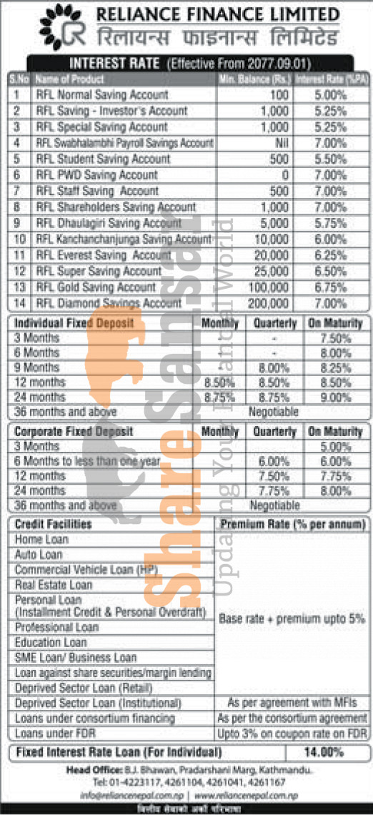Reliance Finance Limited has published a notice regarding the new interest rate for its deposit and loan products and it's effective from 1st Poush, 2077.