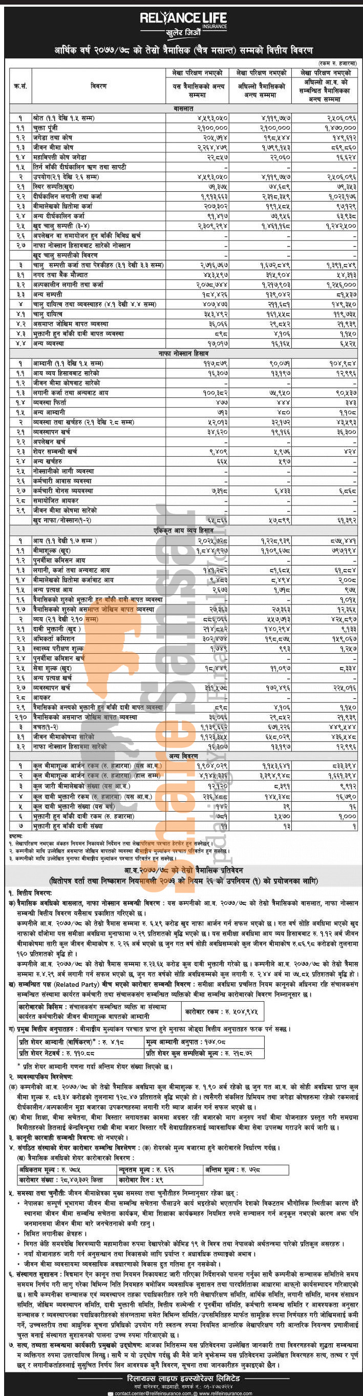 Reliance Life Insurance Limited has posted a net profit of Rs 65.86 million and published its 3rd quarter company analysis of the fiscal year 2077/78.