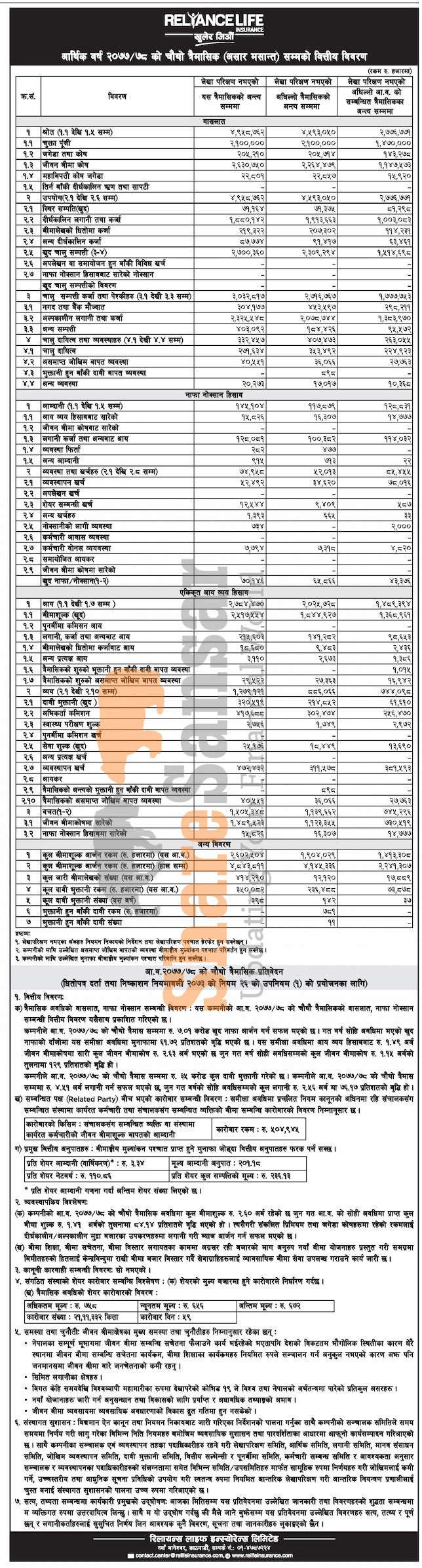 Reliance Life Insurance Limited has posted a net profit of Rs 70.14 million and published its 4th quarter company analysis of the fiscal year 2077/78.