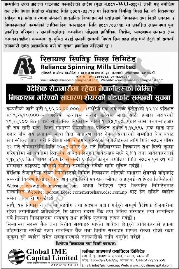 Reliance Spinning Mills Limited has allotted its 1,15,596 units IPO Shares to Foreign Nepalese Employees on 1st Poush, 2082.