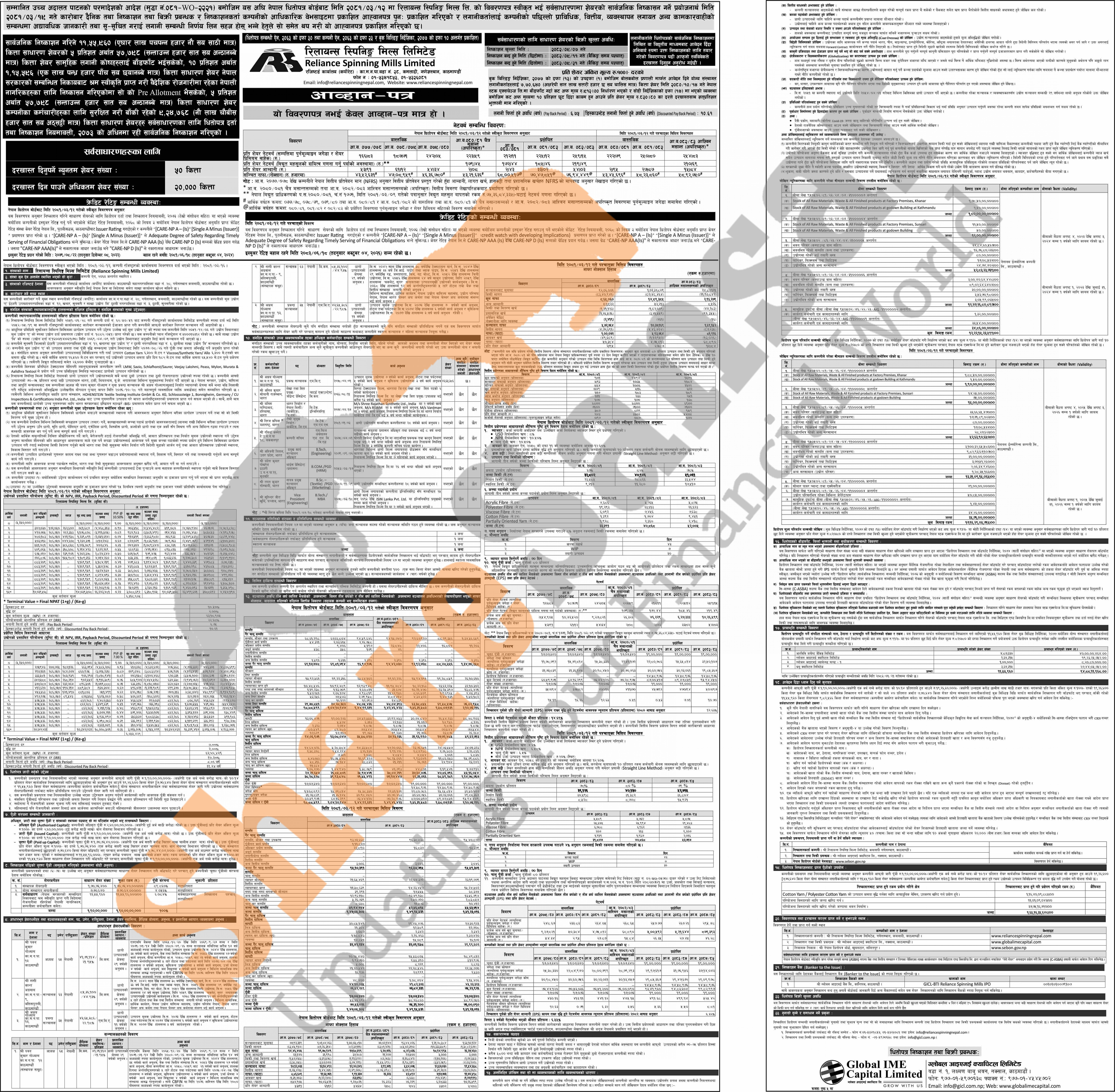 Reliance Spinning Mills Limited has published an offer letter to issue 9,24,768 units IPO shares to the general public from 7th Poush to 11th Poush, 2082.