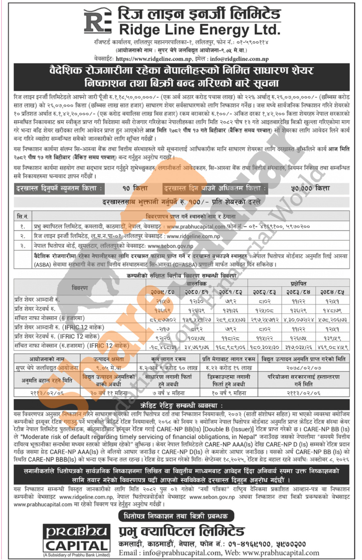 Ridge Line Energy Limited is closing its 1,42,200 units IPO Shares to Foreign Nepalese Employees from today (17th Poush, 2082).