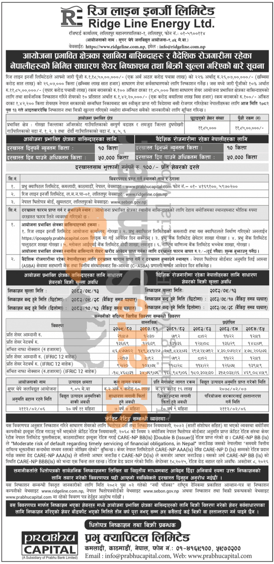 Ridge Line Energy Limited is opening its 11,85,000 units IPO shares to the project-affected locals of Gorkha and Lamjung District and 1,42,200 units IPO Shares to Foreign Nepalese Employees from  today(13th Poush, 2082).