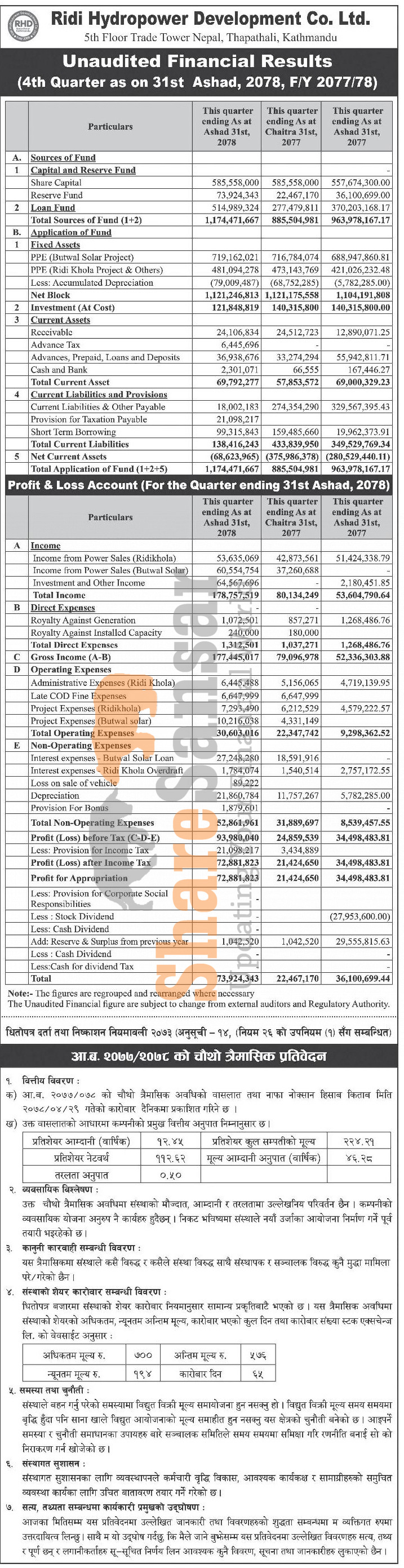 Ridi Hydropower Development Company Limited has posted a net profit of Rs 72.88 million and published its 4th quarter company analysis of the fiscal year 2077/78.