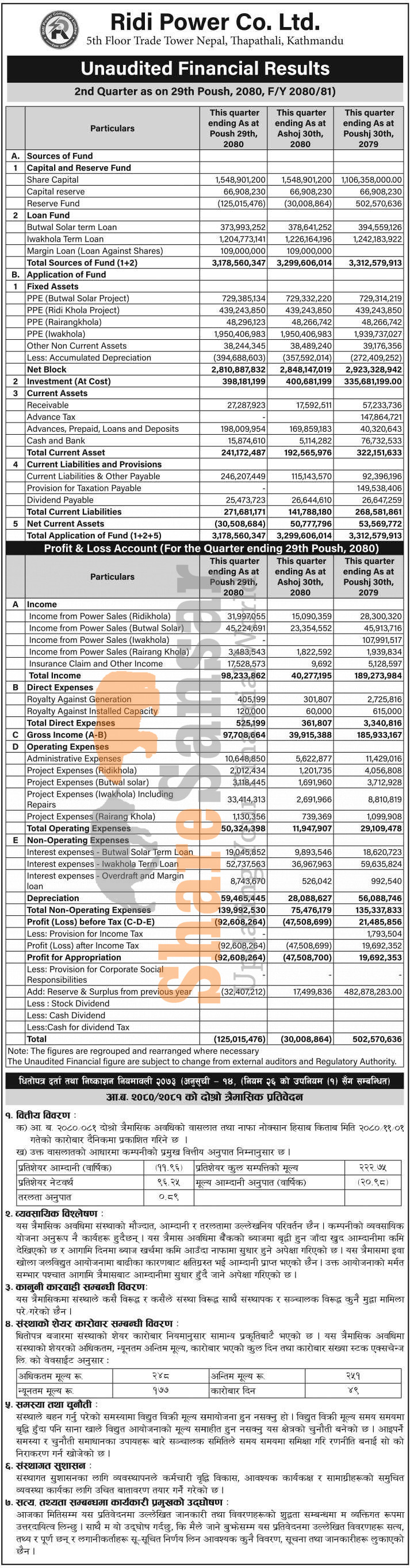 Ridi Power Company Limited has posted a net loss of Rs 92.60 million and published its 2nd quarter company analysis of the fiscal year 2080/81.