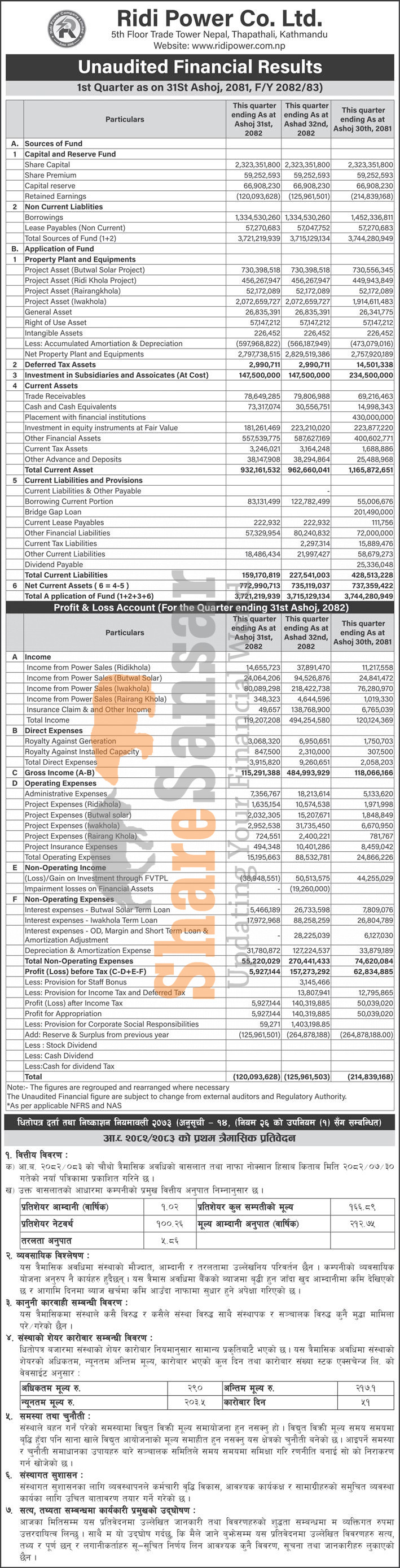 Ridi Power Company Limited has posted a net profit of Rs 5.92 million and published its 1st quarter company analysis of the fiscal year 2082/83.