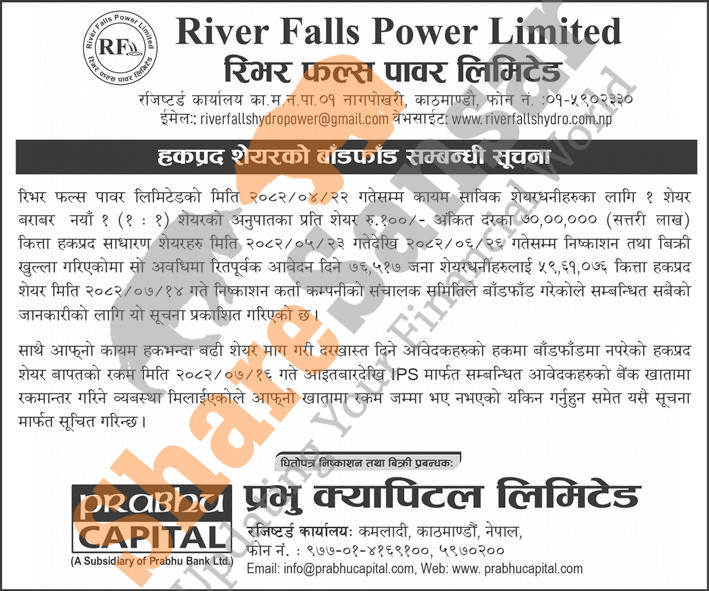 River Falls Power Limited has allotted its 1:1 ratio 70,00,000 units right share to its shareholders on 14th Kartik, 2082.