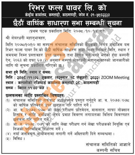 River Falls Power Limited has announced its 6th AGM going to be held on 6th Falgun, 2078.