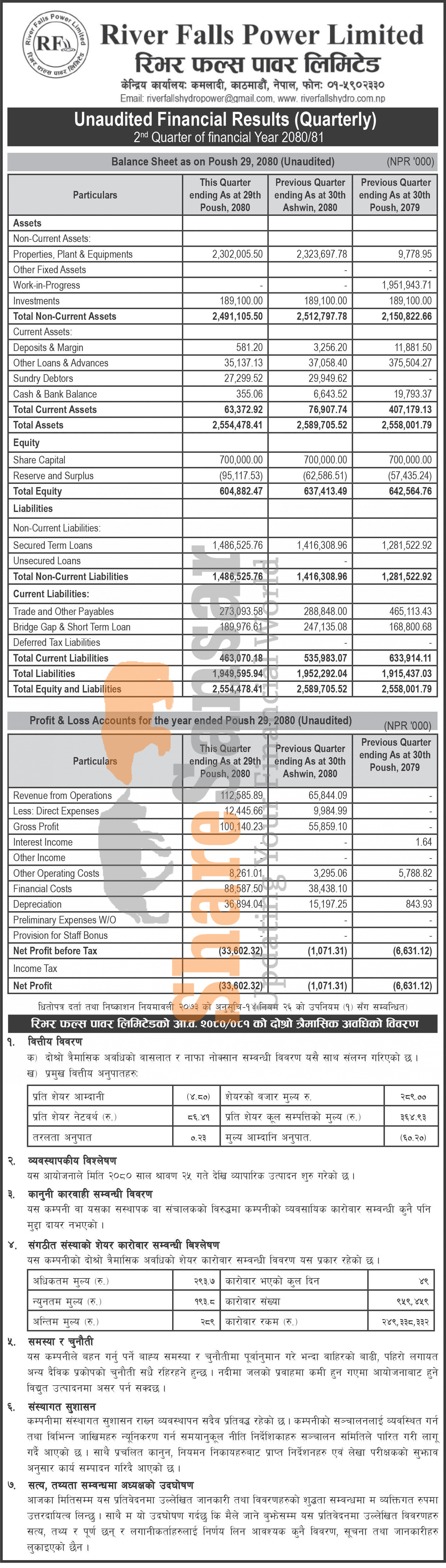 River Falls Power Limited has posted a net loss of Rs 33.60 million and published its 2nd quarter company analysis of the fiscal year 2080/81.