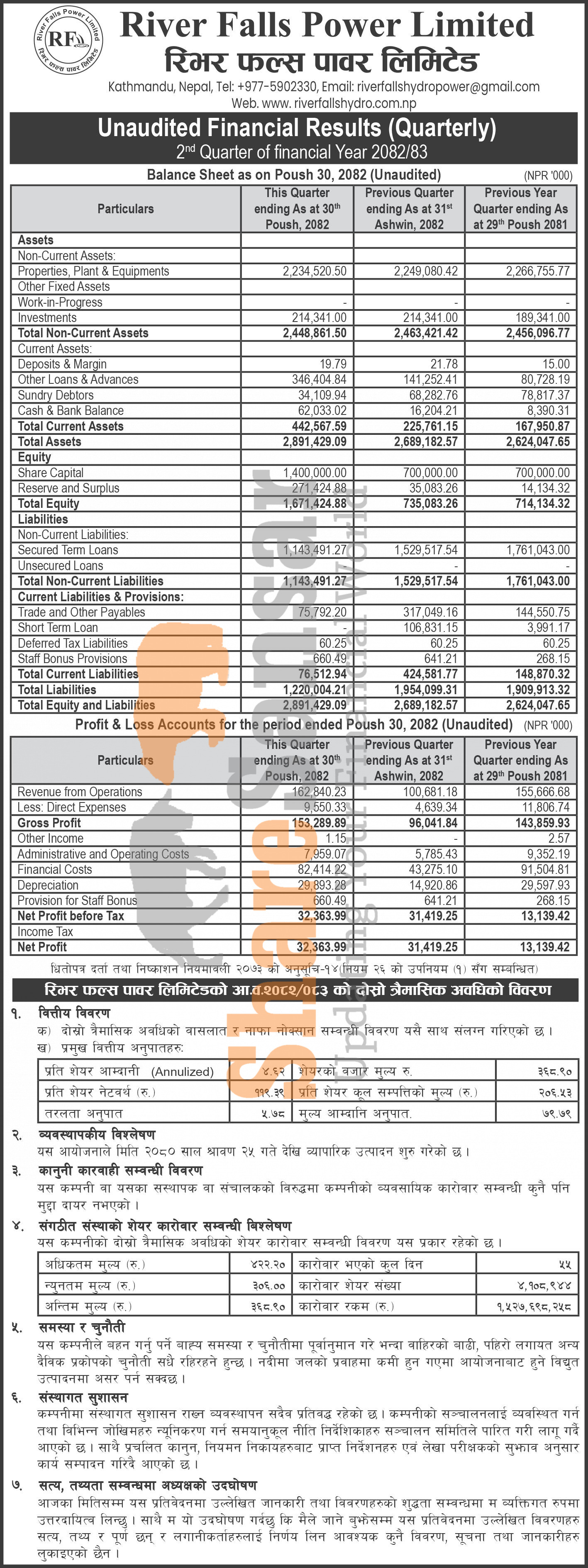 River Falls Power Limited has posted a net profit of Rs 32.36 million and published its 2nd quarter company analysis of the fiscal year 2082/83.