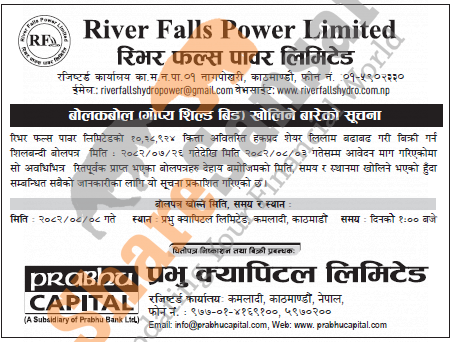 River Falls Power Limited has published bid opening date for 10,38,924 units of ordinary shares (unsold right shares) in an auction to the interested person/company/institutions on 8th Mangsir, 2082.