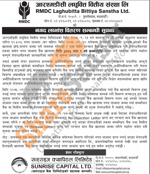 RMDC Laghubitta Bittiya Sanstha Limited is distributing 12.50% cash dividend directly to bank accounts to its shareholders and urged its shareholders to dematerialize their shares.