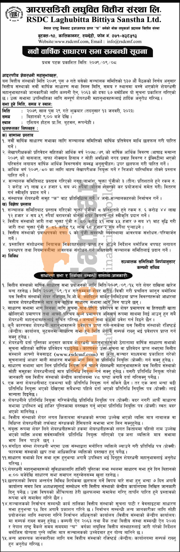 RSDC Laghubitta Bittiya Sanstha Limited has announced its 9th AGM going to be held on 29th Poush, 2079.