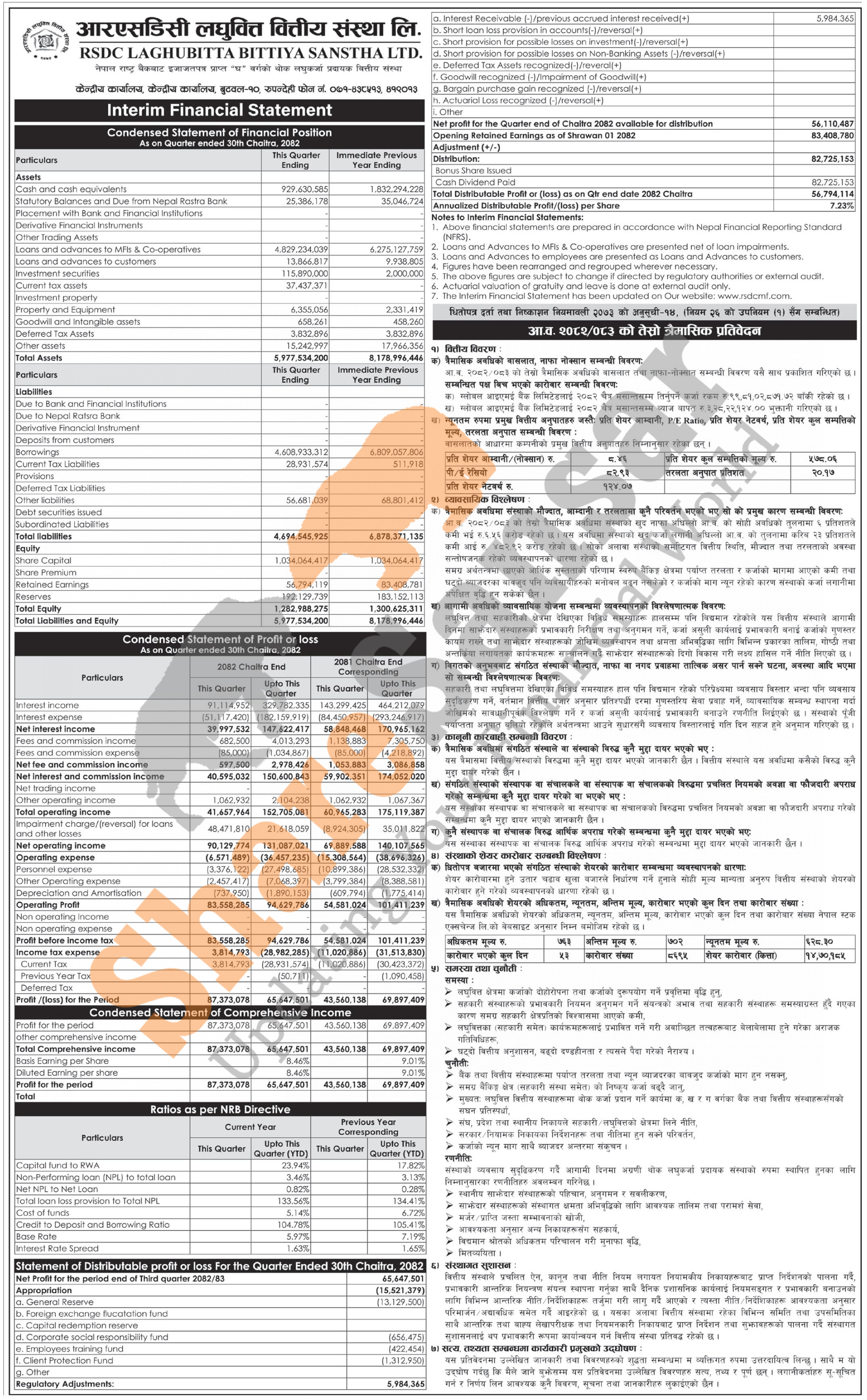 RSDC Laghubitta Bittiya Sanstha Limited has posted a net profit of Rs 65.64 million and published its 3rd quarter company analysis of the fiscal year 2082/83.
