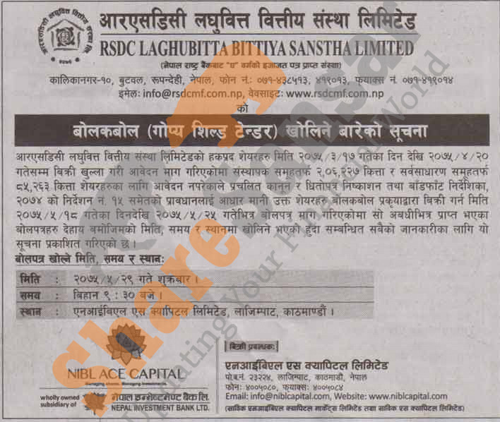 RSDC Laghubitta Bittiya Sanstha Limited has published a notice regarding bid opening date of 2,06,227 unit promoter shares and 85,263 unit ordinary shares in auction to the general public on today (29th Bhadra, 2075).
