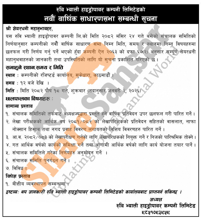 Ruby Valley Hydropower Limited has announced its 9th AGM going to be held on 18th Poush, 2082.