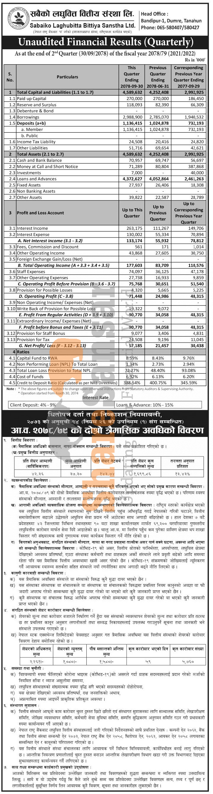Sabaiko Laghubitta Bittiya Sanstha Limited has posted a net profit of Rs 57.18 million and published its 2nd quarter company analysis of the fiscal year 2078/79.