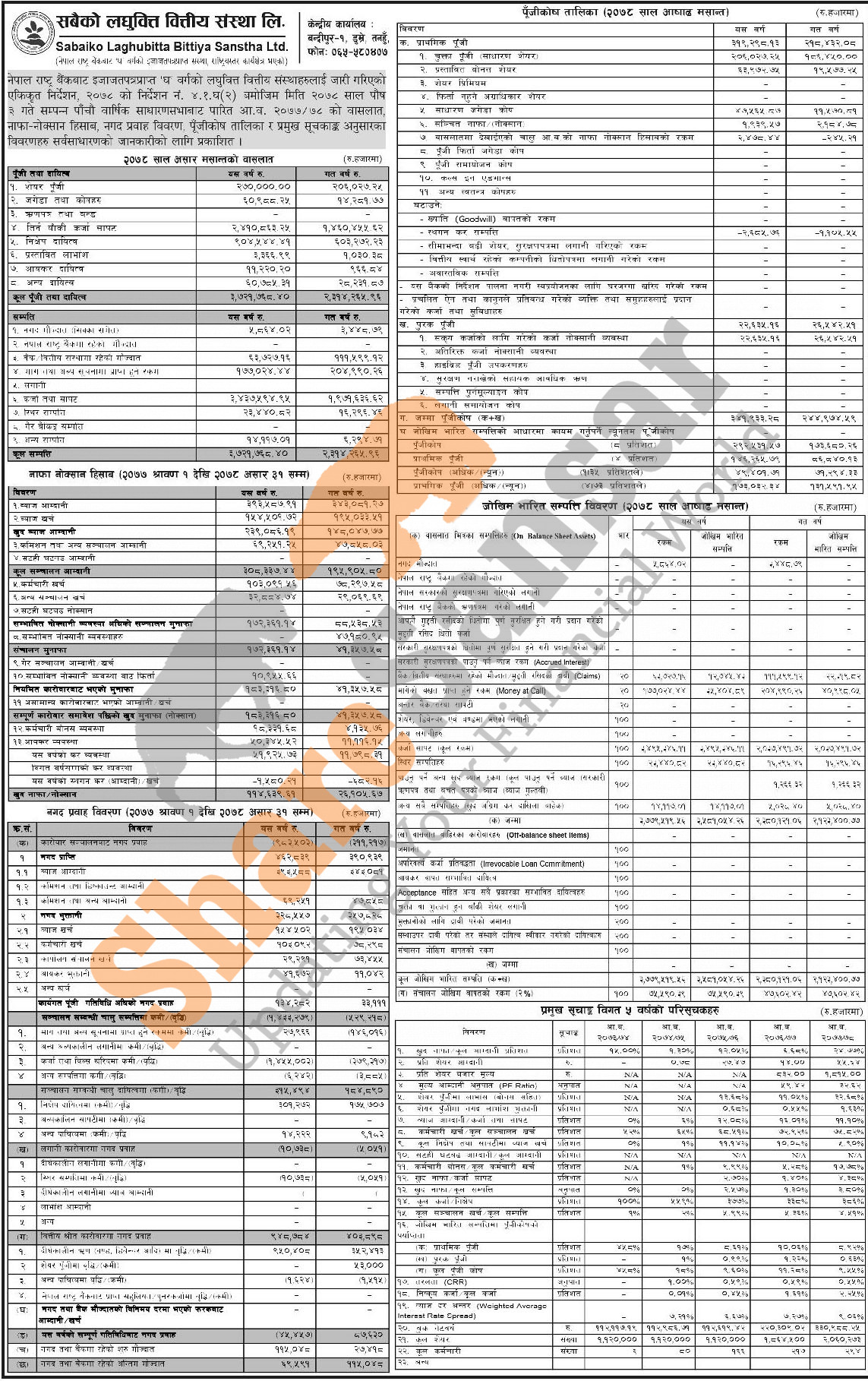 Sabaiko Laghubitta Bittiya Sanstha Limited has published its annual financial highlights of the fiscal year 2077/78.