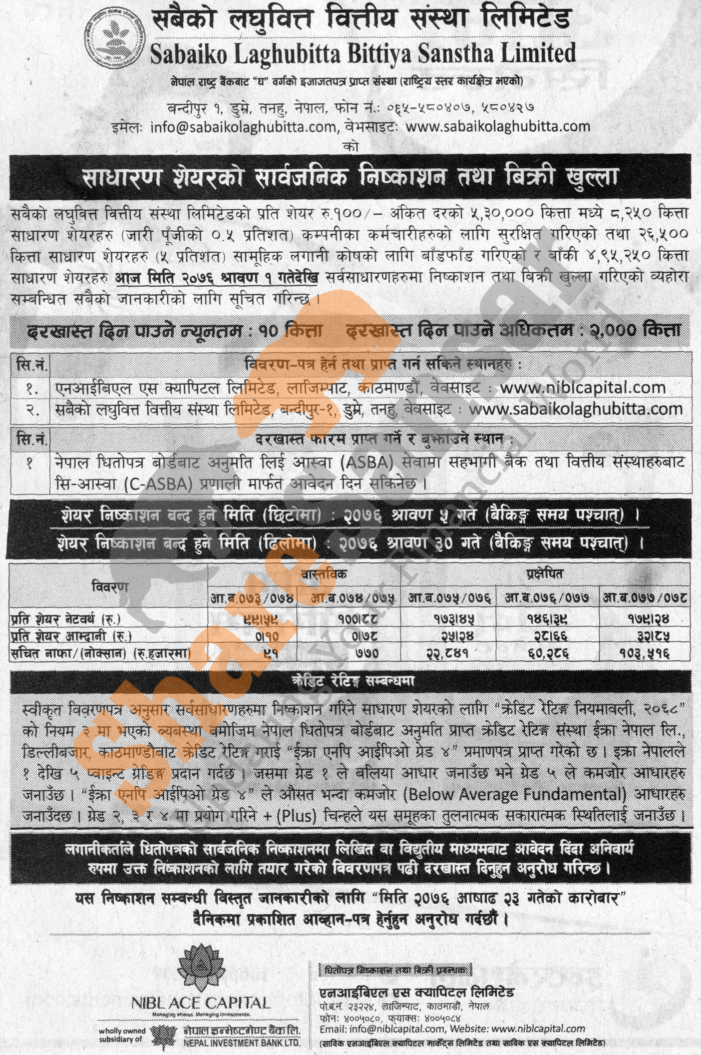 Sabaiko Laghubitta Bittiya Sanstha Limited is issuing its 5,30,000 units IPO shares to the general public from today (1st Shrawan, 2076).