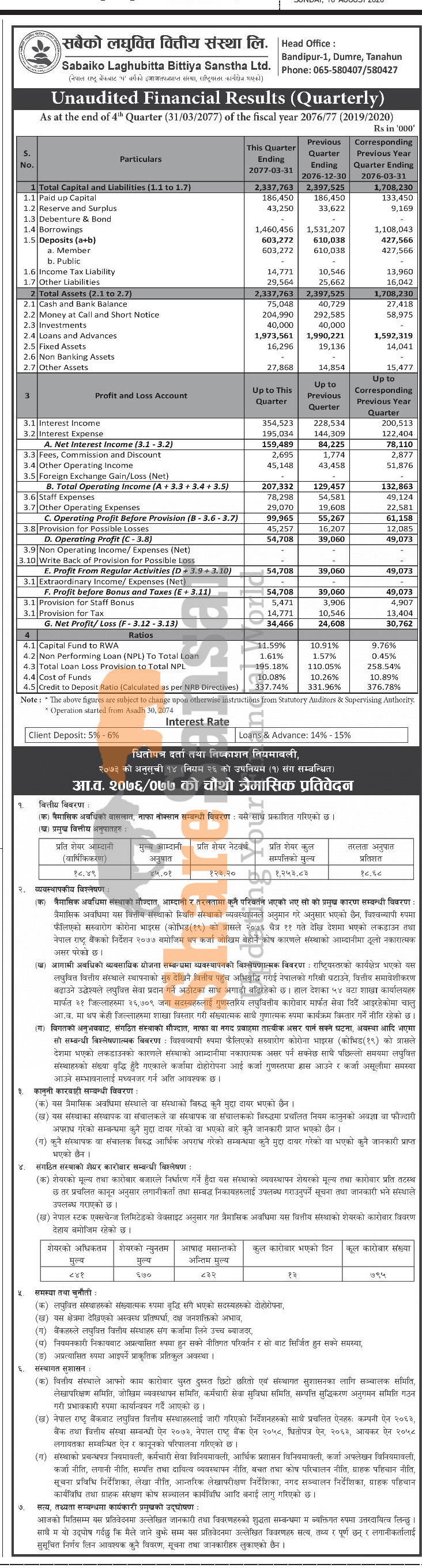 Sabaiko Laghubitta Bittya Sanstha Limited has posted a net profit of Rs 34.46 million and published its 4th quarter company analysis of the fiscal year 2076/77.