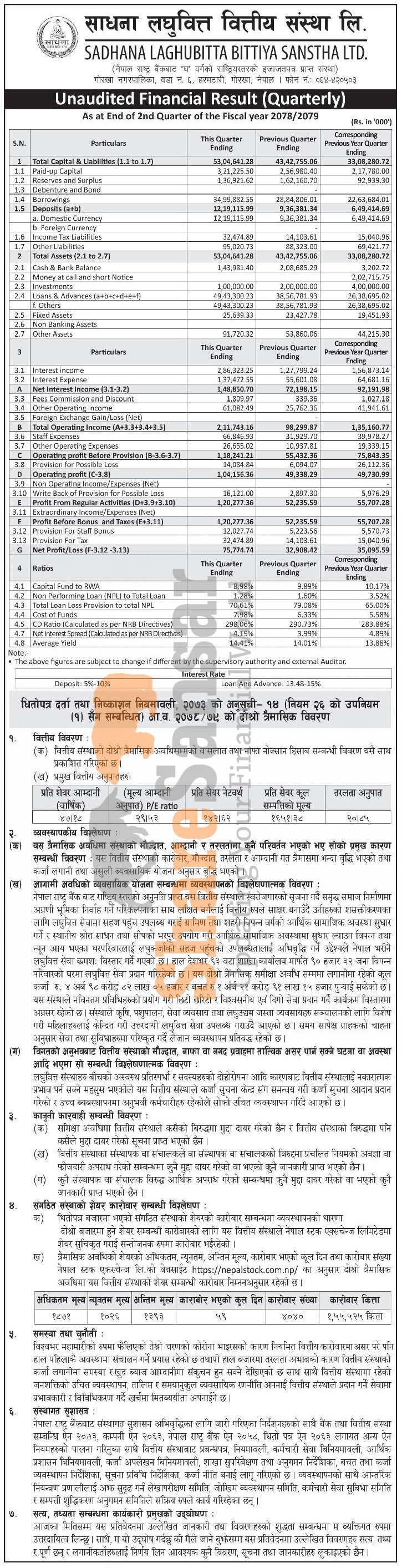 Sadhana Laghubitta Bittiya Sanstha Limited has posted a net profit of Rs 75.77 million and published its 2nd quarter company analysis of the fiscal year 2078/79.