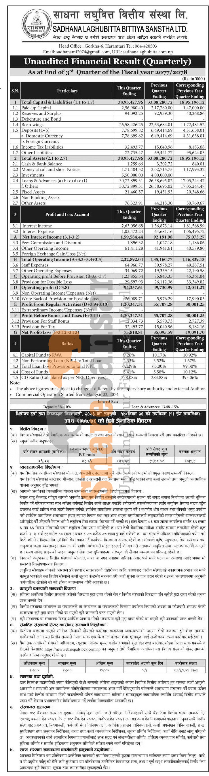 Sadhana Laghubitta Bittiya Sanstha Limited has posted a net profit of Rs 75.81 million and published its 3rd quarter company analysis of the fiscal year 2077/78.