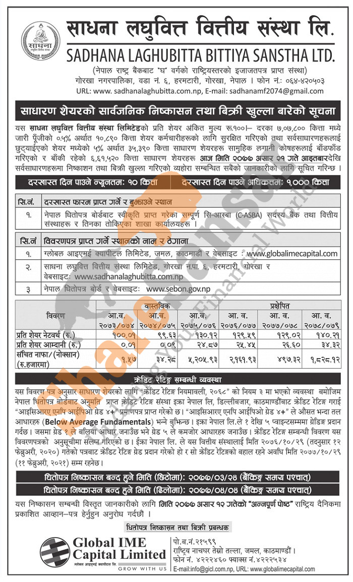 Sadhana Laghubitta Bittiya Sanstha Limited is issuing its 7,07,800 units IPO shares to the general public from today (21st Ashad, 2077).