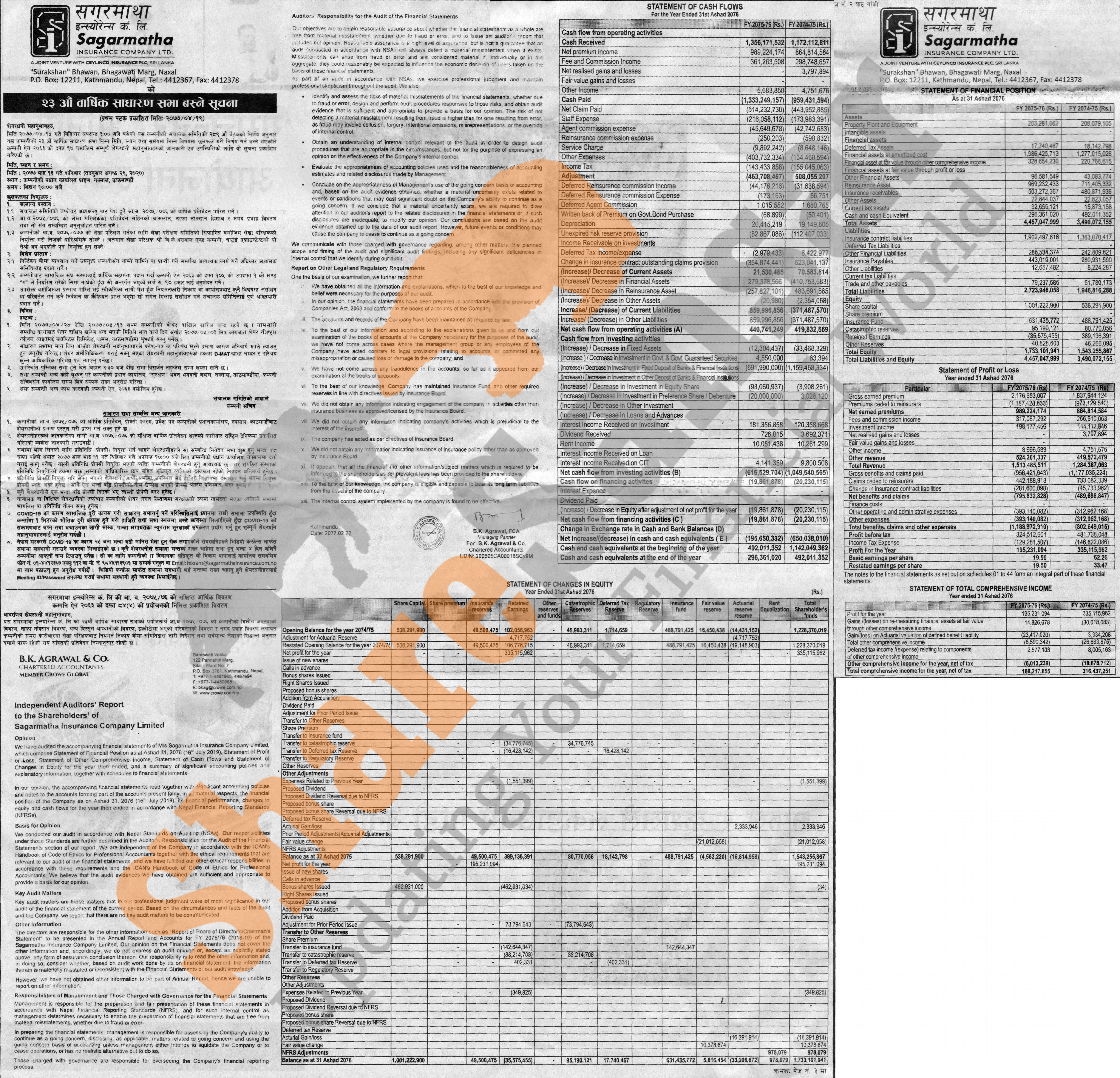 Sagarmatha Insurance Company Limited has announced its 23rd AGM going to be held on 13th Bhadra, 2077 and published its audited financial highlights of the fiscal year 2075/76.