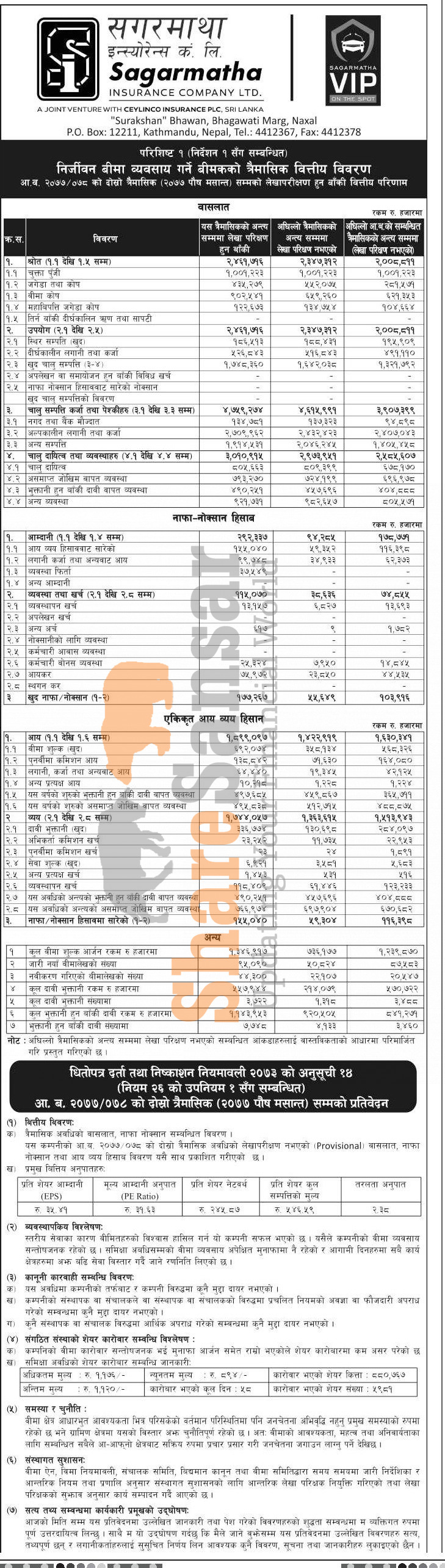 Sagarmatha Insurance Company Limited has posted a net profit of Rs 177.26 million and published its 2nd quarter company analysis of the fiscal year 2077/78.