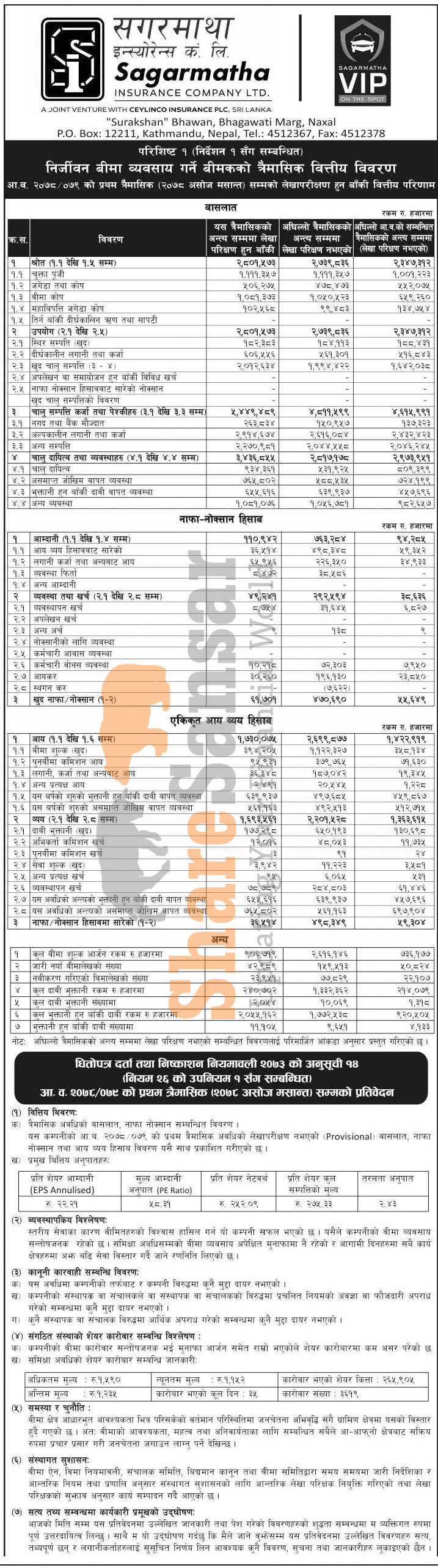 Sagarmatha Insurance Company Limited has posted a net profit of Rs 61.70 million and published its 1st quarter company analysis of the fiscal year 2078/79.