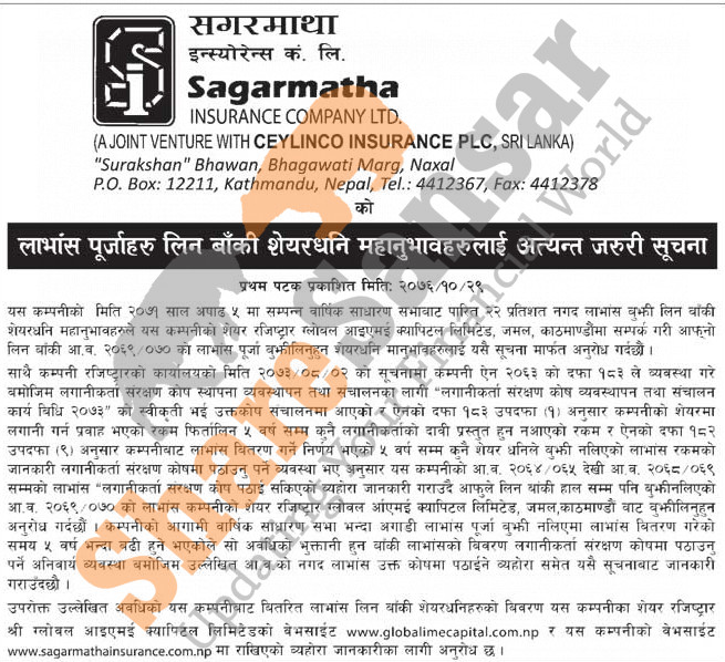 Sagarmatha Insurance Company Limited urges its shareholders to collect uncollected due dividends.