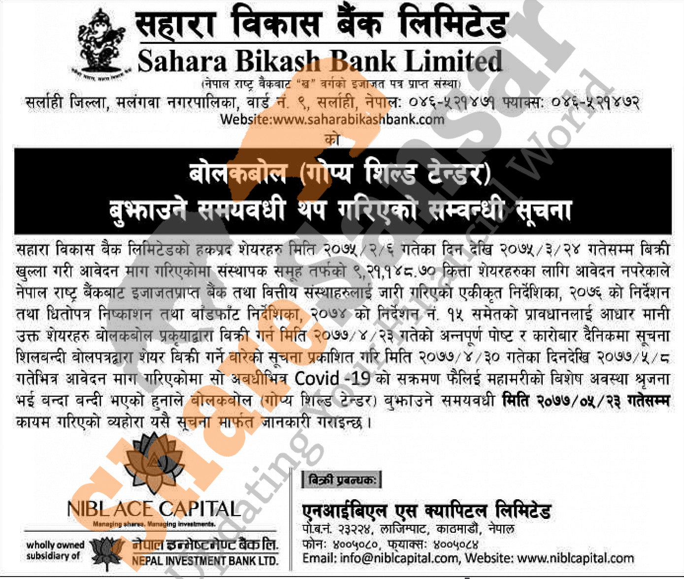 Sahara Bikas Bank Limited has extended its 9,21,148.70 units promoter share in an auction to the general public till (23rd Bhadra, 2077).