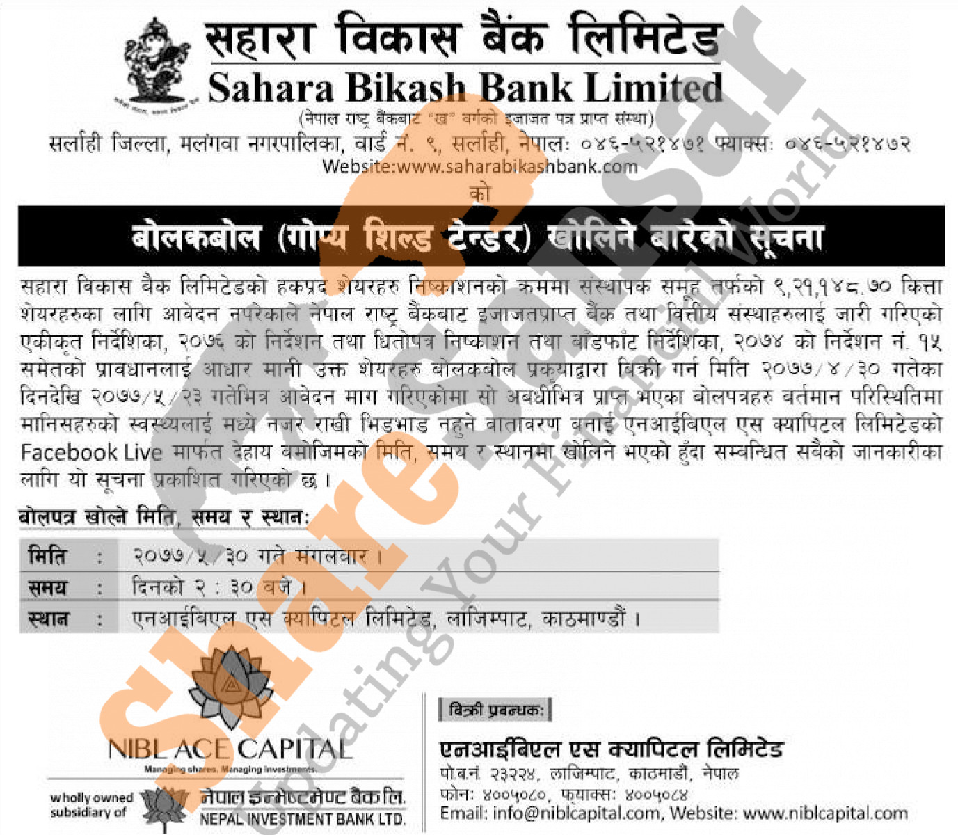 Sahara Bikas Bank Limited has published a notice regarding bid opening date of 9,21,148.70 units promoter share in the auction to the general public on (30th Bhadra, 2077).