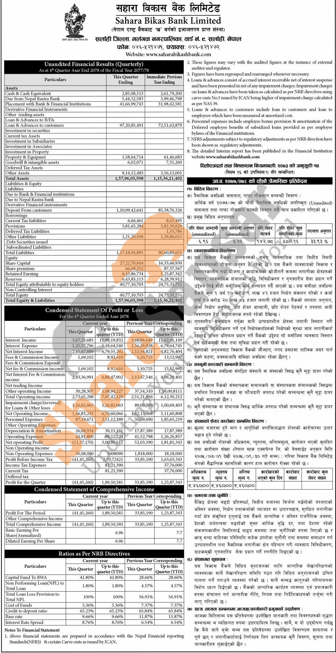Sahara Bikash Bank Limited has posted a net profit of Rs 18.95 million and published its 4th quarter company analysis of the fiscal year 2077/78.