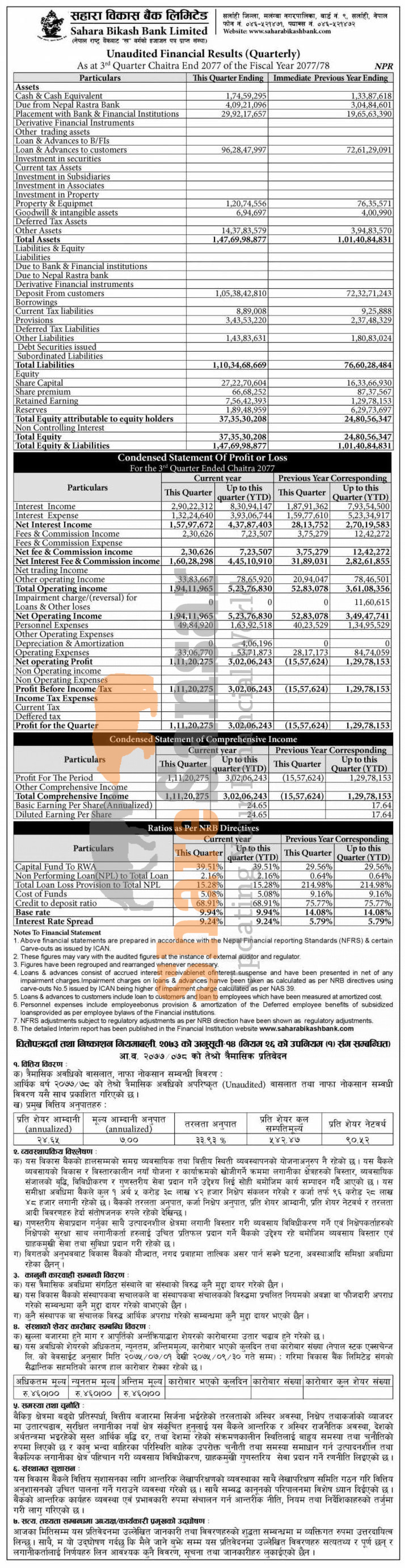 Sahara Bikash Bank Limited has posted a net profit of Rs 30.20 million and published its 3rd quarter company analysis of the fiscal year 2077/78.