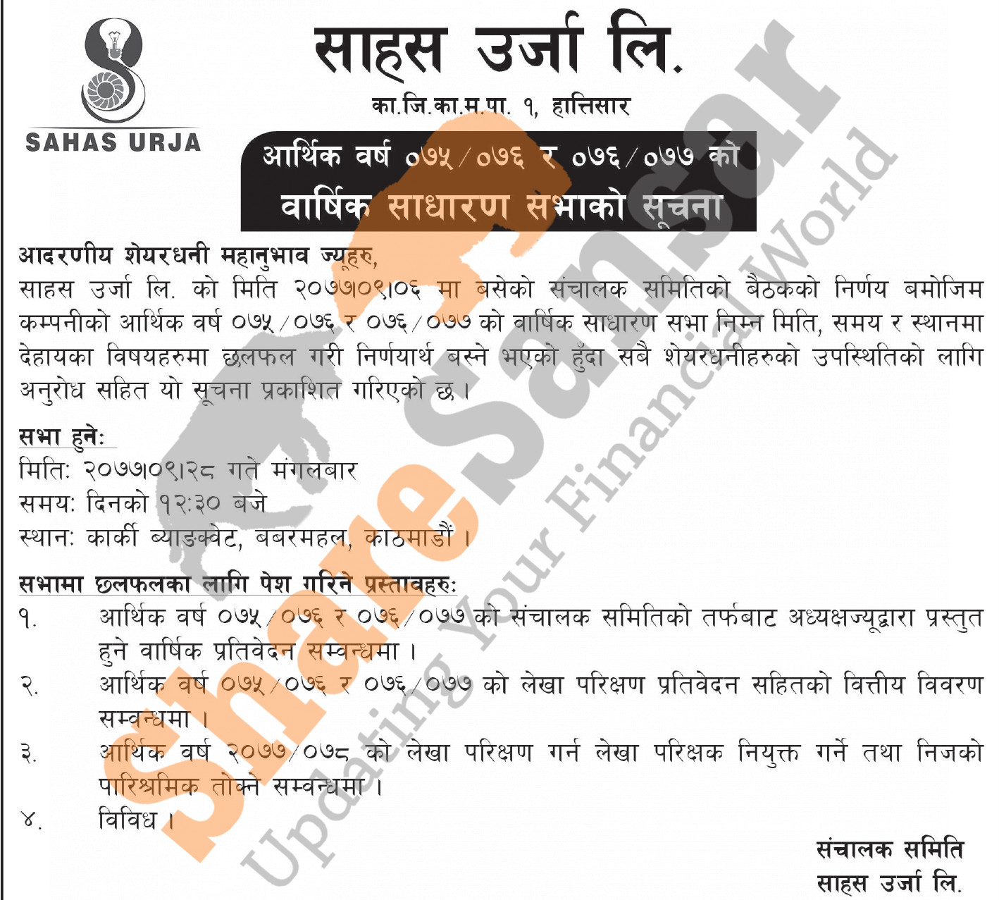Sahas Urja Limited has announced its Annual General Meeting going to be held on 28th Poush, 2077.