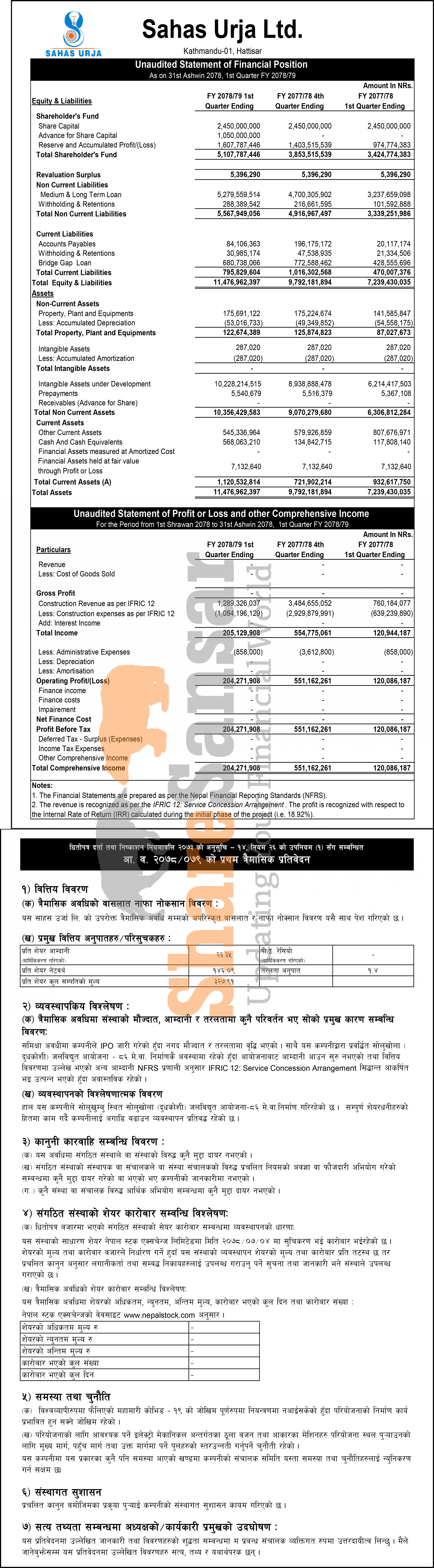 Sahas Urja Limited has posted a net profit of Rs 204.27 million and published its 1st quarter company analysis of the fiscal year 2078/79.