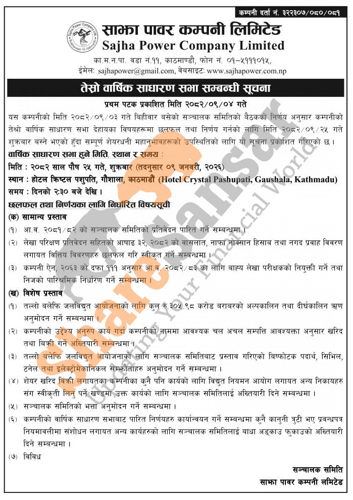 Sajha Power Company Limited has announced its 3rd AGM going to be held on 25th Poush, 2082.
