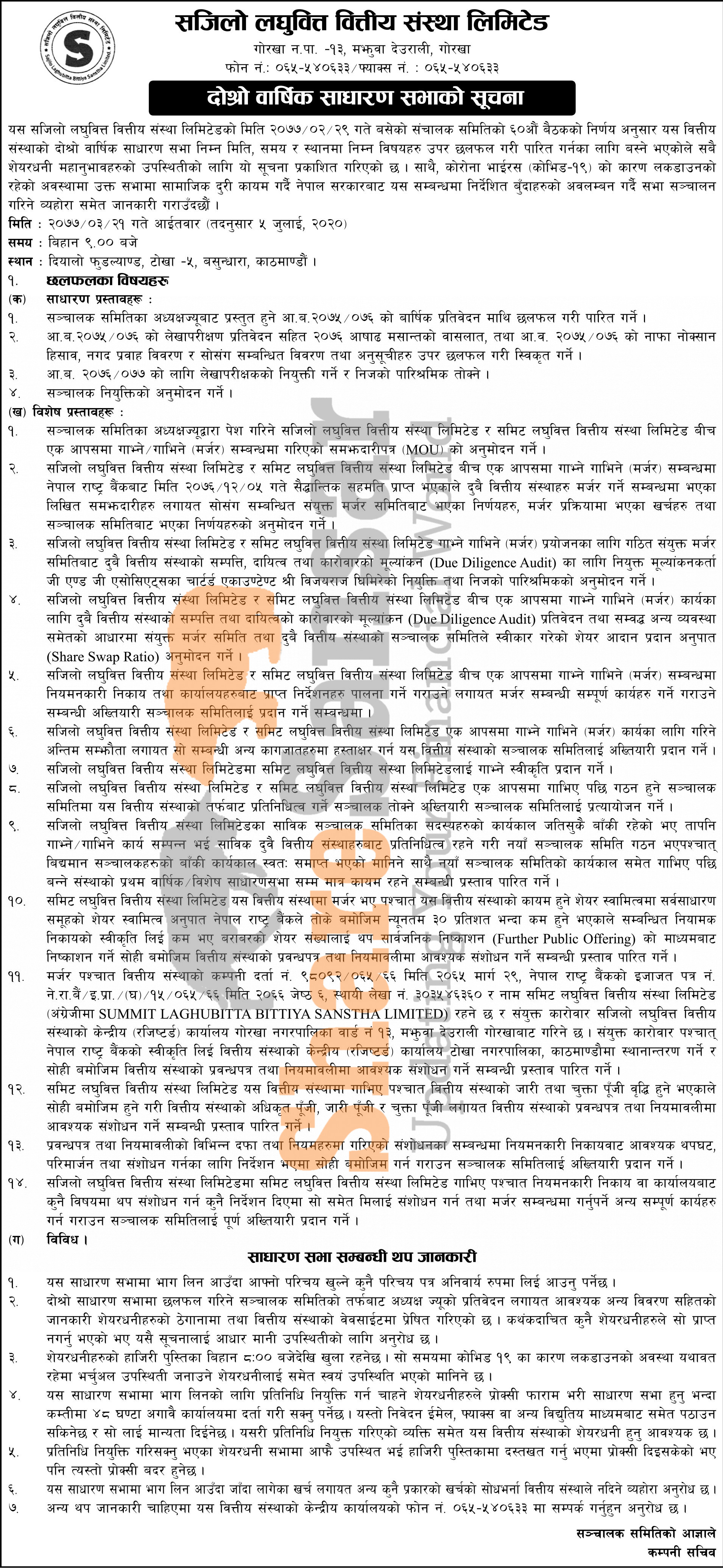 Sajilo Laghubitta Bittiya Sanstha Limited has announced its 2nd AGM going to be held on 21st Ashad, 2077.