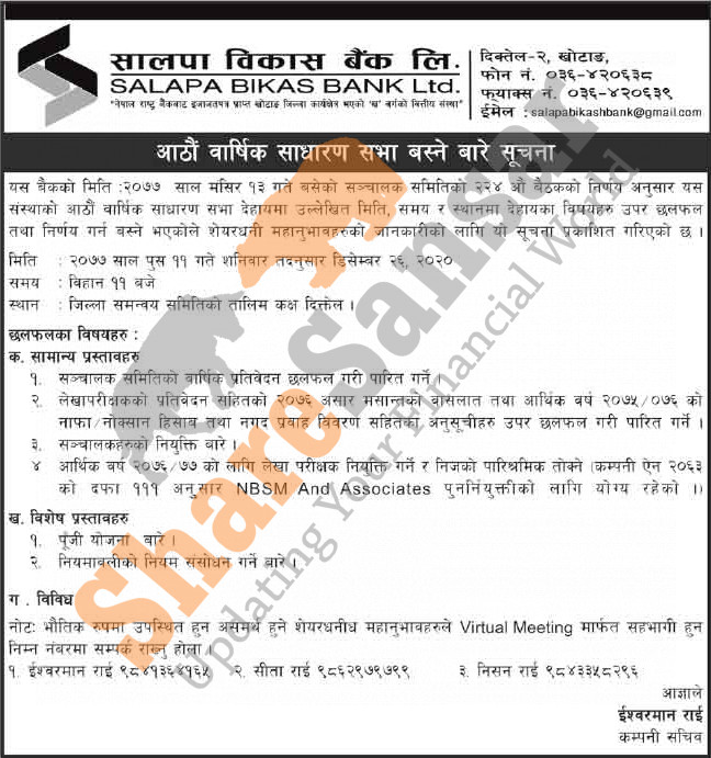 Salapa Bikas Bank Limited has announced its 8th AGM going to be held on 11th Poush, 2077.