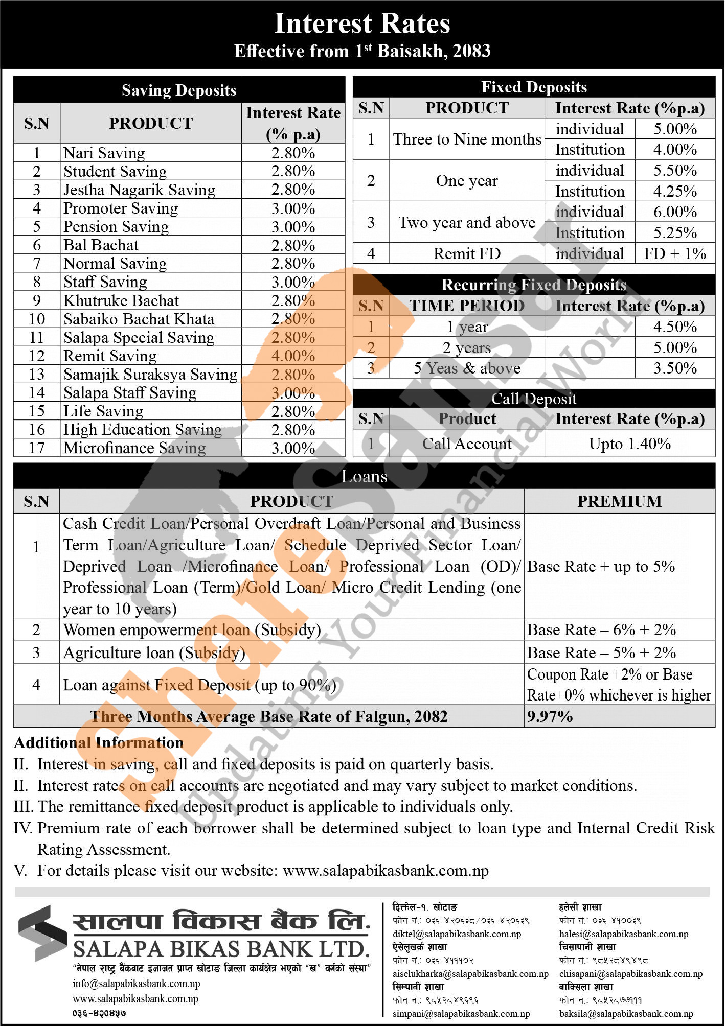 Salapa Bikas Bank Limited has published a notice regarding the new interest rate for deposit and loan products and it's effective from 1st Baisakh, 2083.
