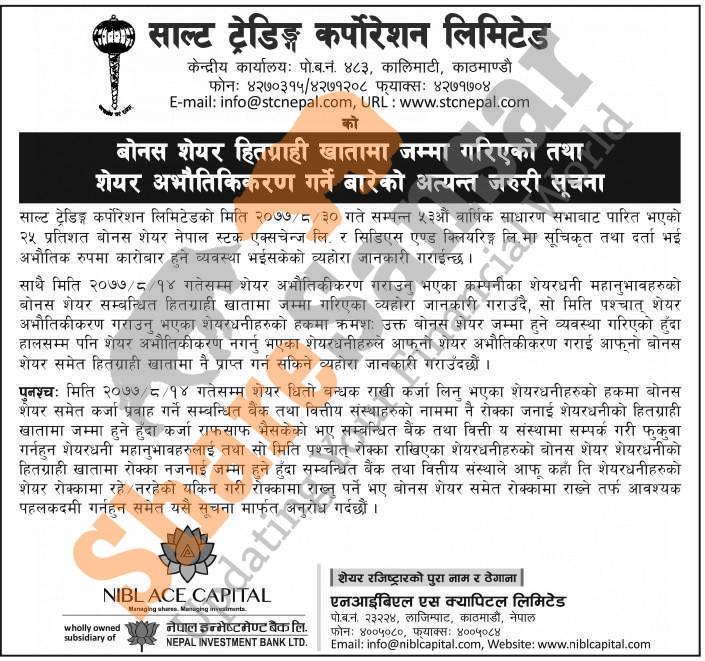 Salt Trading Corporation Limited has distributed 25% bonus shares directly to DEMAT accounts of its shareholders and has urged to dematerialize their shares.