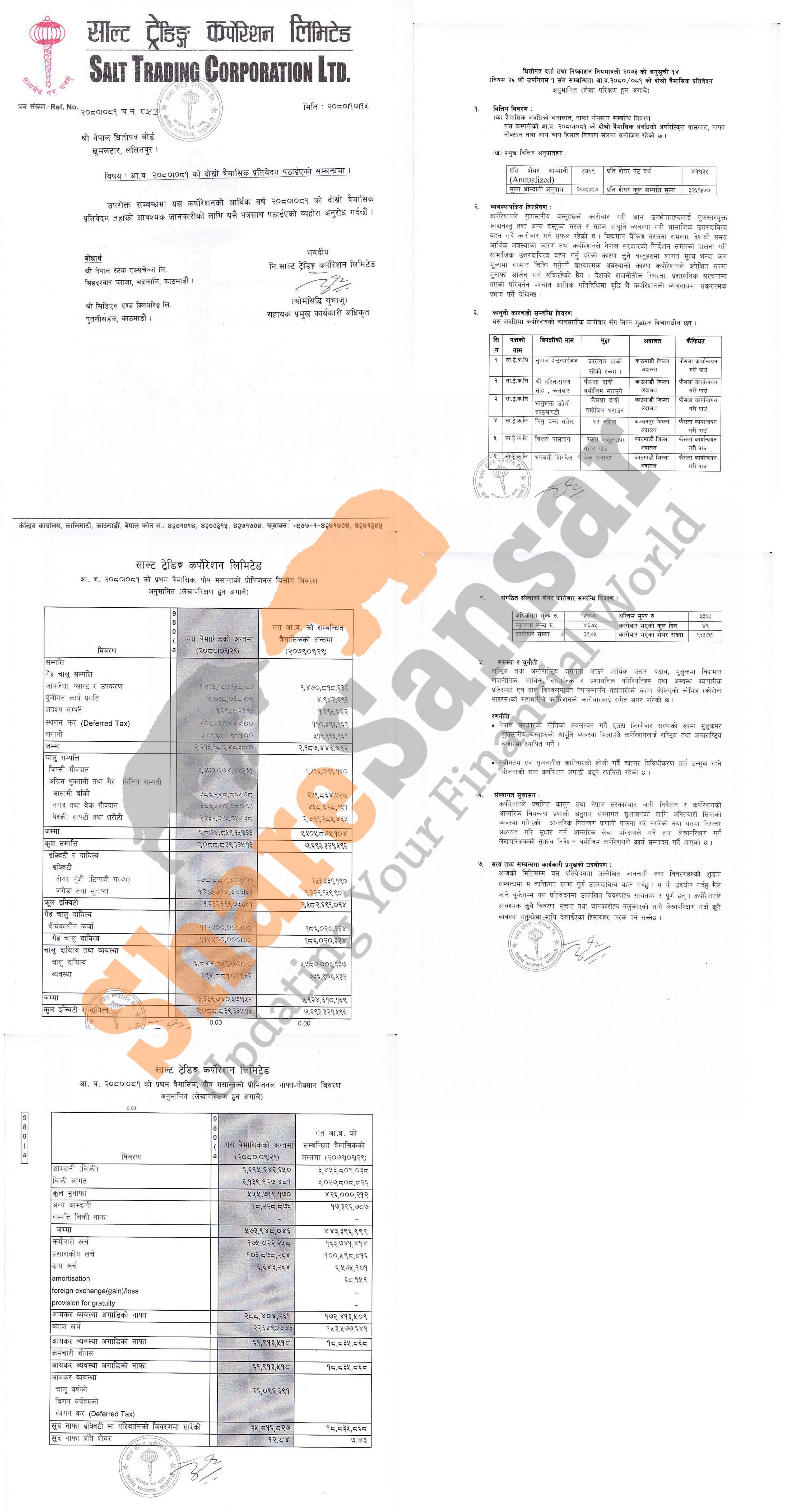 Salt Trading Corporation Limited has posted a net profit of Rs 35.81 million and published its 2nd quarter company analysis of the fiscal year 2080/81.